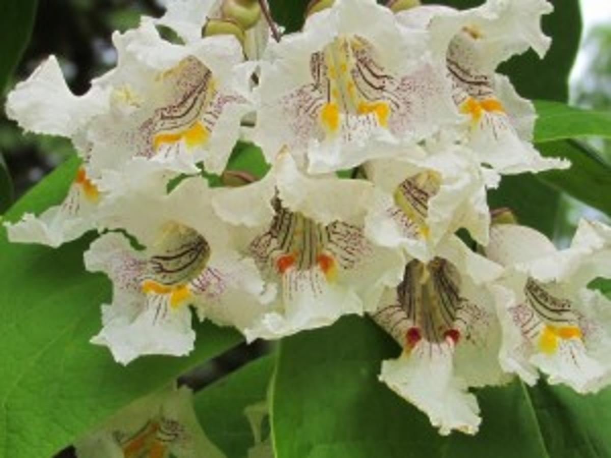 Southern catalpa is native to Alabama Georgia Florida and Mississippi. Catalpa prefers moist deep well drained soil but adapts to dry or wet soils. Very showy white with purple streaks in branched upright cluster arranged in bell-shaped corollas of 5 lobes appearing in late spring.